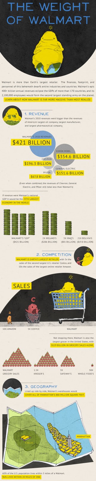 In an effort to make sense of it all, I thought it would be fun to share this infographic showing the real power of Walmart. The company is huge and is the largest retailer in the world. The infographic was created by FrugalDad and is very well done.